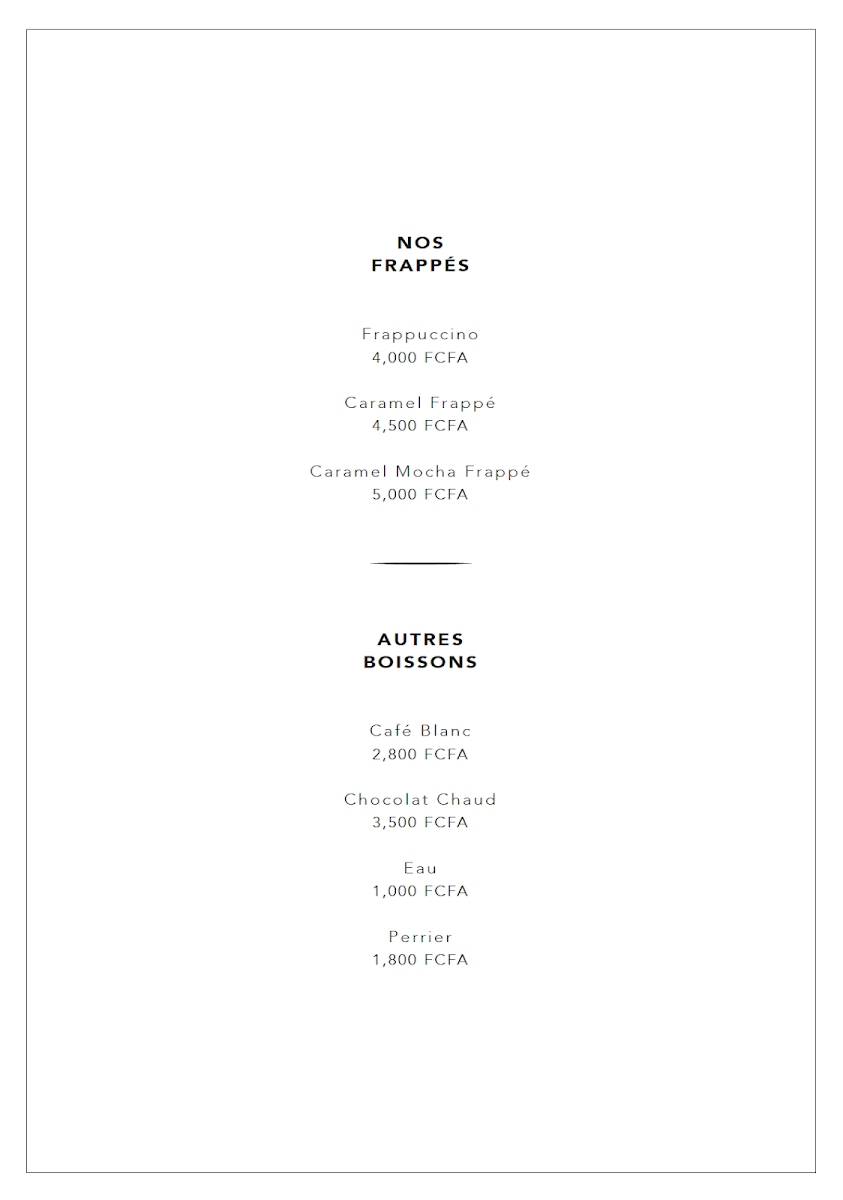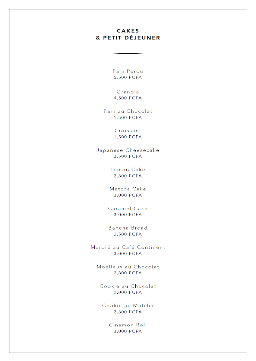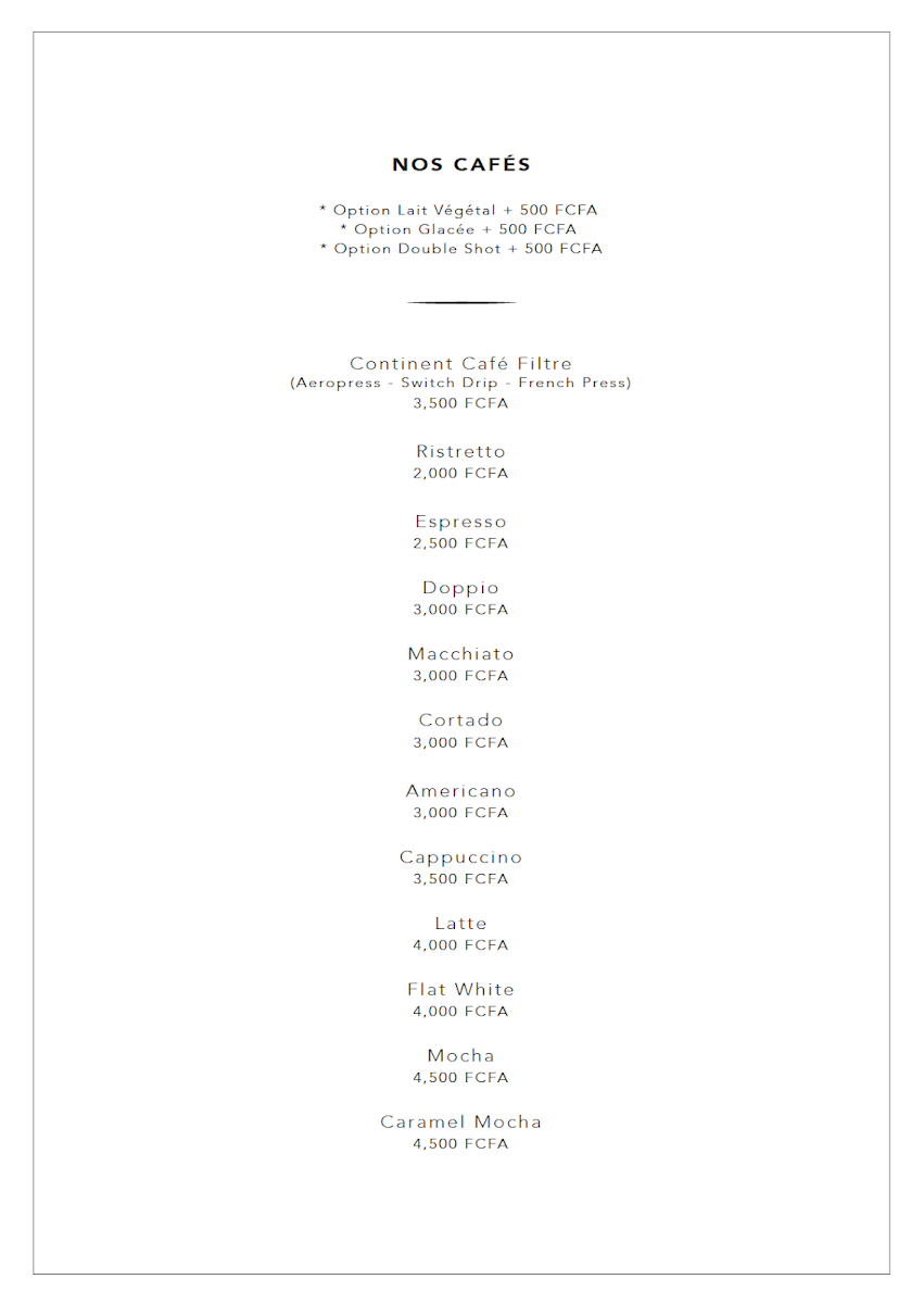 From a reviewer’s perspective, the menu at Café Continent offers a pleasant mix of comforting classics and trendy café favorites, even though prices are not specified. The beverage selection stands out, with options like Chocolat Chaud, Café Blanc, and Eau Perrier providing simple yet satisfying choices. The breakfast and pastry section is particularly appealing, featuring treats such as Marbré Au Café Continent, Croissant, Lemon Cake, Matcha Cake, and Japanese Cheesecake, all suggesting a balance between traditional French-inspired items and modern flavors. For those seeking indulgent drinks, the frappé range-including Carama Mocha Frappé, Caramel Frappé, and Frappuccino-adds a rich, dessert-like dimension. Coffee lovers are well catered to with hot options like Flat White, Macchiato, Espresso, Continent Café Filtre, and Espresso Lungo, alongside refreshing cold alternatives such as Iced Macchiato, Iced Americano, Iced Cappuccino, Iced Latte, and Iced Mocha. The tea selection, with items like Matcha Macchiato, Matcha Latté, Hojicha Kagoshima, Hojicha Latté, and Hojicha Macchiato, adds a refined touch for tea enthusiasts. Finally, the cookie assortment-including Cookies Chocolat Fleur De Sel, Cookie Au Chocolat, Cookie Pistache, Cookie Au Matcha, and Cookies Aux Amandes Noisette-rounds out the menu with a variety of sweet bites. Overall, the menu feels diverse and thoughtfully curated, appealing to a wide range of tastes despite the absence of listed prices.